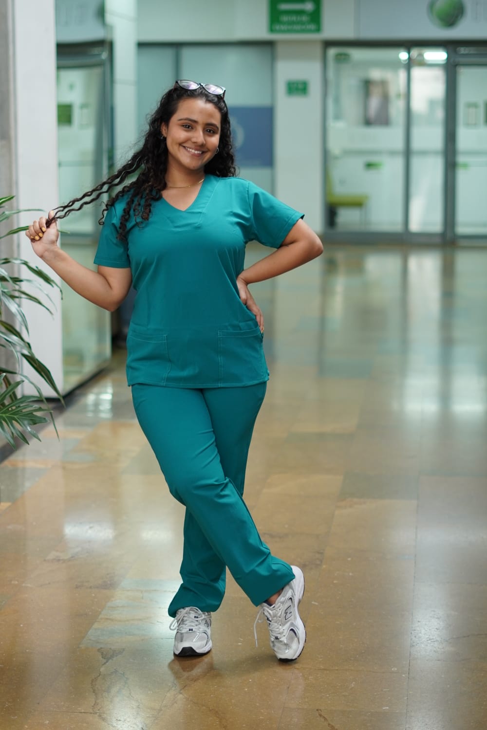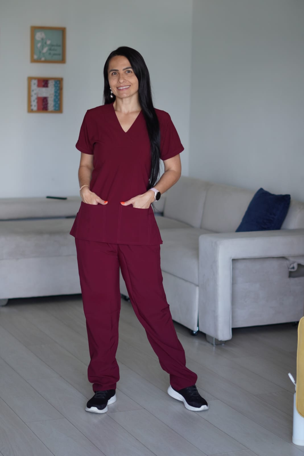 La blusa cuenta con un favorecedor cuello en V y bolsillos funcionales en la parte inferior. El pantalón, de corte recto clásico, estiliza la figura brindando un look impecable y sobrio, complementado con una pretina elástica reforzada que garantiza máxima comodidad y ajuste.